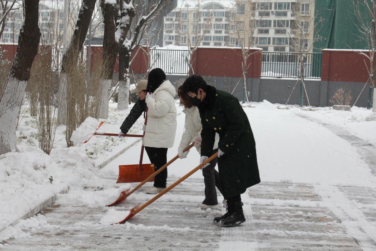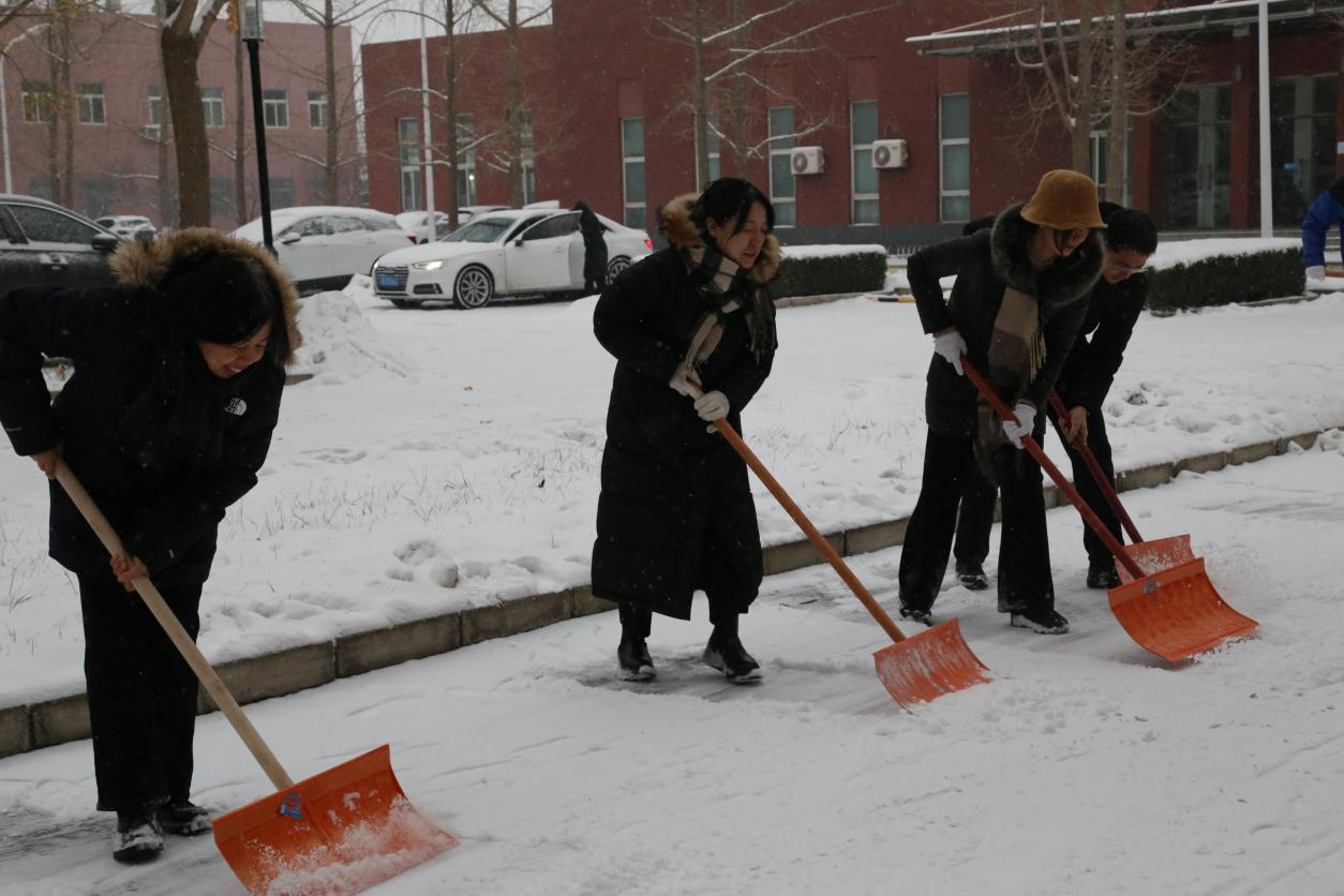 落雪是景,除雪是情。在寒冷的天气里,SB博彩 师生全身心地投入扫雪除冰的工作中。他们挥舞着扫帚、雪铲等工具,将道路中间的积雪逐渐堆到道路两侧。你一铲、我一铲,经过大家的团结协作和辛勤劳动,清除了文发楼前、五号楼附近和停车场上的积雪与薄冰。