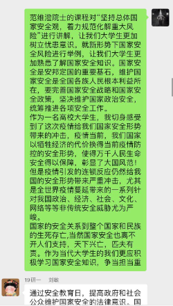 深入学习国家安全观。通过全体研究生同上一堂国家安全教育课、线上深入开展国家安全主题教育班团活动、以及组织学生集体线上学习国家安全相关政策法规等,我院研究生系统学习了国家安全观的主要内容,了解了国家安全战略方针和总体部署。特别是深入学习宣传习近平总书记在国家安全工作座谈会上的重要讲话精神,领会中央精神,提高了思想认识。