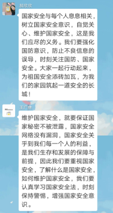 广泛开展宣传教育。我院研究生围绕政治安全、经济安全、国土安全、文化安全、社会安全、科技安全、网络安全、生态安全等方面,开展系列宣传活动。利用微信班级群、钉钉班级群等组织开展线上班会,使每名学生均参与到国家安全教育的学习中,积极营造维护国家安全的浓厚氛围。全员参与线上答题,提高了同学们对国家安全知识的认识与了解,也让同学们意识到国家的安全关系到整个国家和民族的生死存亡,天下兴亡,匹夫有责,更能够让同学们牢记知识,掌握政策,使他们成为争当担当重任的中国青年。