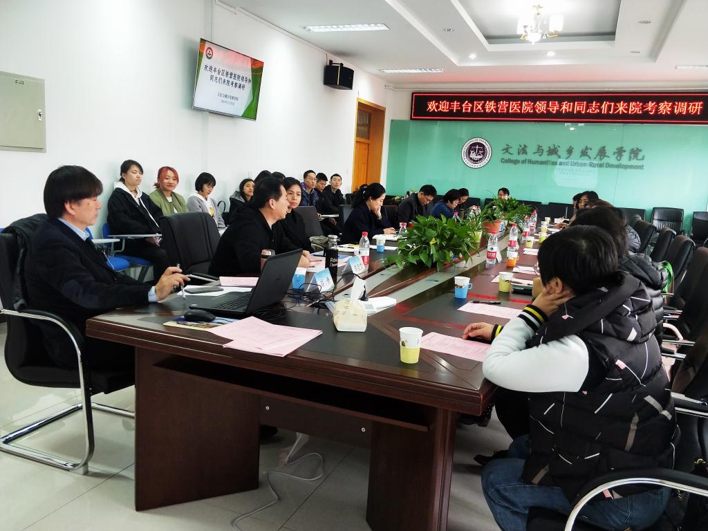 赵洪娥同志代表学院致欢迎辞并详细介绍了学院的发展情况。刘继霞同志向与会人员详细介绍了铁营医院的整体情况,同时对医务社工特别是对双方将在社会康复领域开展合作表示了充分肯定与支持。她强调要充分利用铁营医院丰富的资源,为社工专业学生提供良好的实践平台,切实使学生受益。社工系主任胡勇和MSW社会工作硕士教育中心主任李宝龙分别介绍了社工本科及专硕阶段人才培养、社会服务等方面的成果及经验,双方就此次校企合作、共同培养人才的建设思路等做了深入讨论。韩芳同志代表学院致答辞时表示,双方可开展深度合作,进一步强化人才培养的实践环节,在行业对人才的培养需求、师资融合、科研项目开发等方面开展深入合作。随后,来宾还实地考察了SB博彩