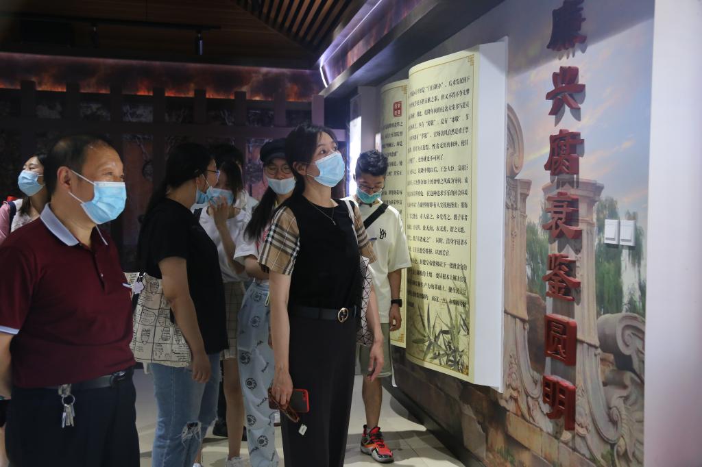 首先,参观队伍自迎晖门进入园内,途径鉴碧亭、残桥、万春湖、涵秋馆,而后经过九曲方木桥、思永斋抵达廉政文化基地。基地共四个展厅,分别是“澄心堂、师善堂、慎德堂、益思堂”。