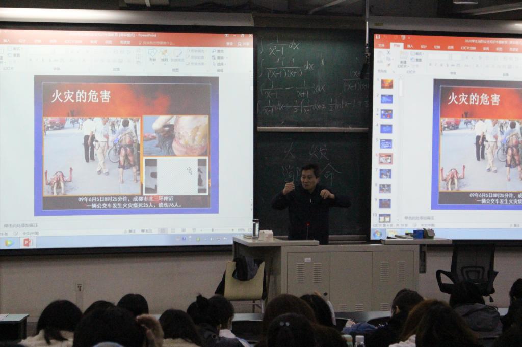 消防讲座活动开始后,于处长通过火灾警示教育视频和PPT展示的形式,让同学们详细了解了火灾的危害以及防范火灾的必要性。