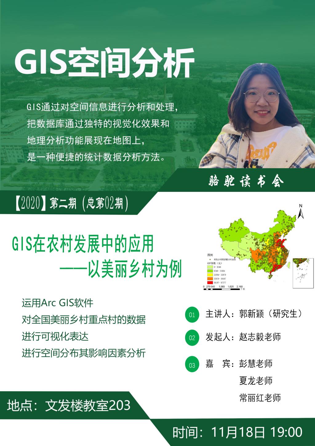 2020年11月18日19:00,我院骆驼读书会在文发楼220教室开展本学期第二次读书分享活动——GIS在农村发展中的应用。SB博彩