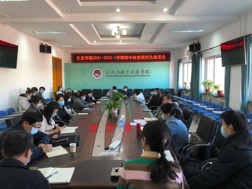 于文发楼322会议室召开2021-2022学年第一学期研究生教学和培养工作期中检查学生座谈会,会议由科研与研究生副院长夏龙主持,院长韩芳、学生工作副院长李云乐、研究生督导刘克锋、农村发展硕士点负责人佟占军、社会工作硕士点负责人胡勇以及研究生秘书董瑞、辅导员安利清参加座谈。