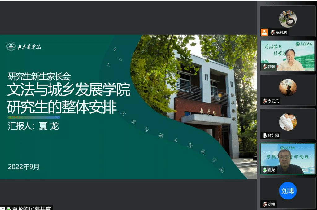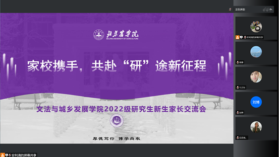通过线上召开2022级研究生新生家长交流会,院长韩芳从多方面向家长们介绍了学院的基本情况、师资力量及科研实力,期望同学们要志存高远、勇担使命,秉承博学尚农,厚德笃行的校训精神,在求学路上尊师重道、以梦为马、不负韶华。科研副院长夏龙为家长们讲解了研究生生涯的整体安排,要求教学与科研并重,学习与创新并重。学生工作副院长李云乐针对研究生管理及疫情常态化各项要求向家长们说明。此次家长交流会为学校和家庭架起了有效沟通的桥梁,使学校教育得到家长的理解、包容和支持。