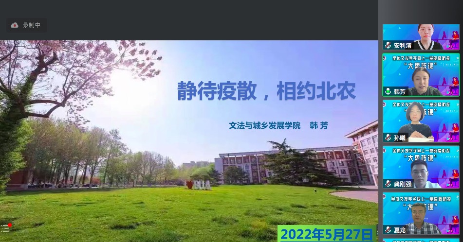 韩芳做《静待疫散,相约北农》的疫情防控专题授课,从中国传统文化对生命的理解入手,引导大家认识生命、敬畏生命、实现生命价值。韩芳指出,当前严峻的疫情形势是对生命的重大挑战,学院疫情防控工作要严格遵守北京市和学校的要求,校内学生要严格落实校园防控措施,居家学习要遵守社区防疫要求。针对疫情期间可能出现的心理现象,大家要做好自我心理防护,慎思明辨、勇于担当、提升本领、乐于奉献,争做新时代好青年。