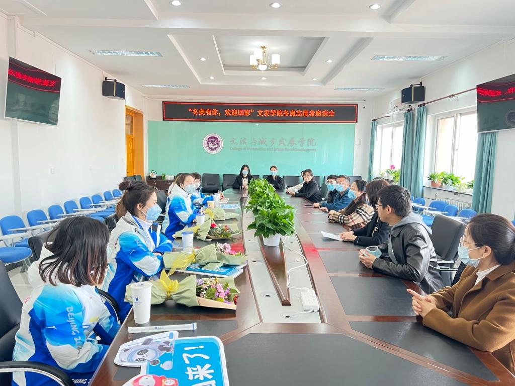 四名闭环内志愿者、三名闭环外志愿者圆满完成冬奥会志愿服务任务。全体服务管家和辅导员老师迎接志愿者返校,随后在文发楼会议室召开“冬奥有你,欢迎回家”冬奥志愿者座谈会。
