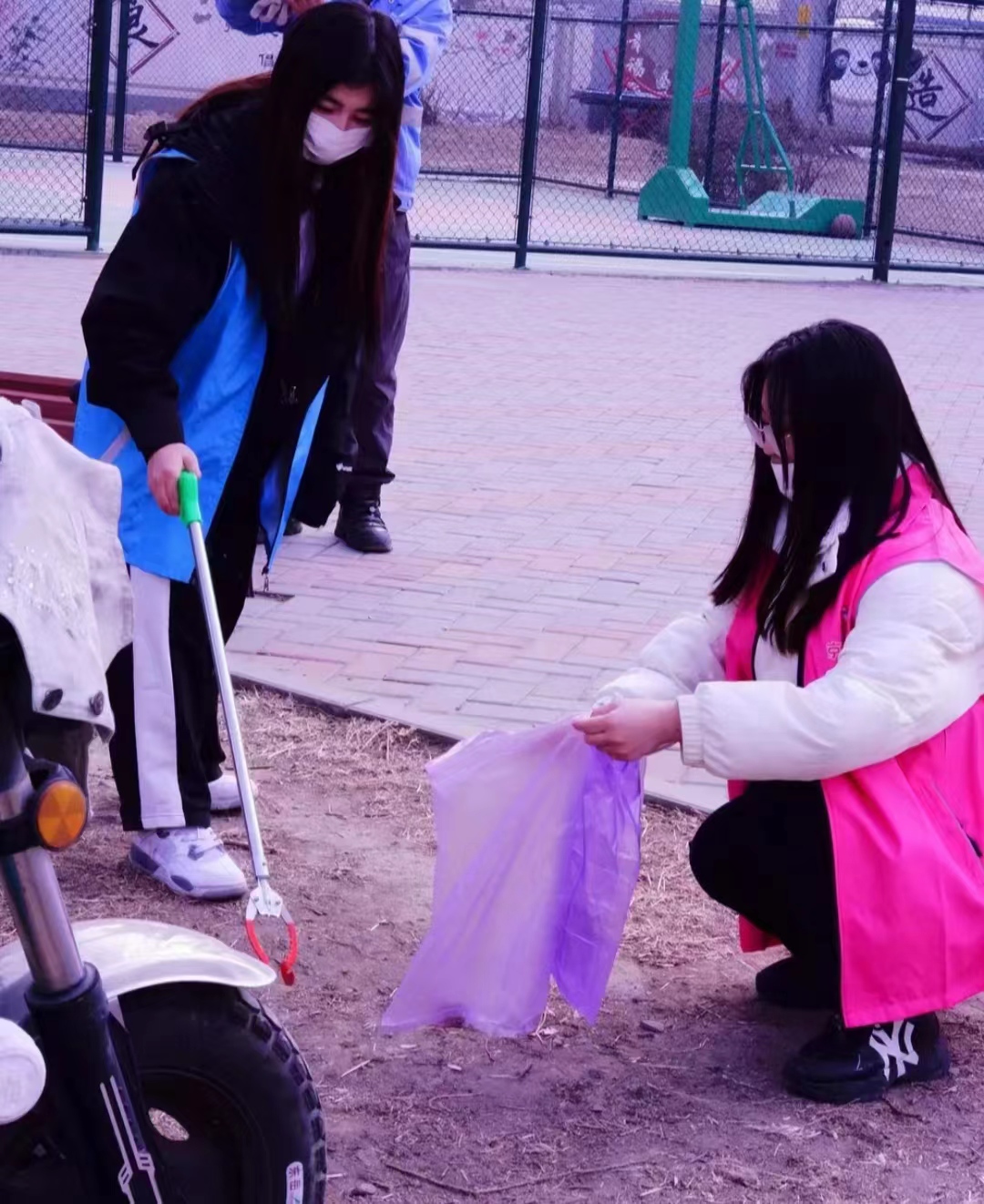 第三组志愿者们在小区里将散落在路边的纸屑、塑料袋、塑料瓶、烟蒂等垃圾捡入垃圾袋并向遇到的居民传递生态环保理念。“志愿红”“志愿绿”成为了一道靓丽的风景线。