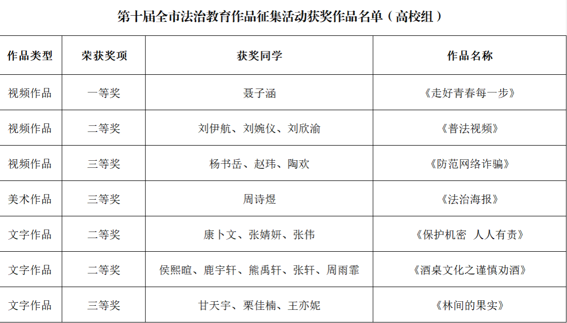 法学系涌现出7个优秀团队,参赛学生在视频作品、美术作品、文字作品多领域均斩获奖项,这次的荣誉不仅是对师生团队智慧和辛勤努力的最好奖赏,更是对学院法治教育水平的高度认可。
