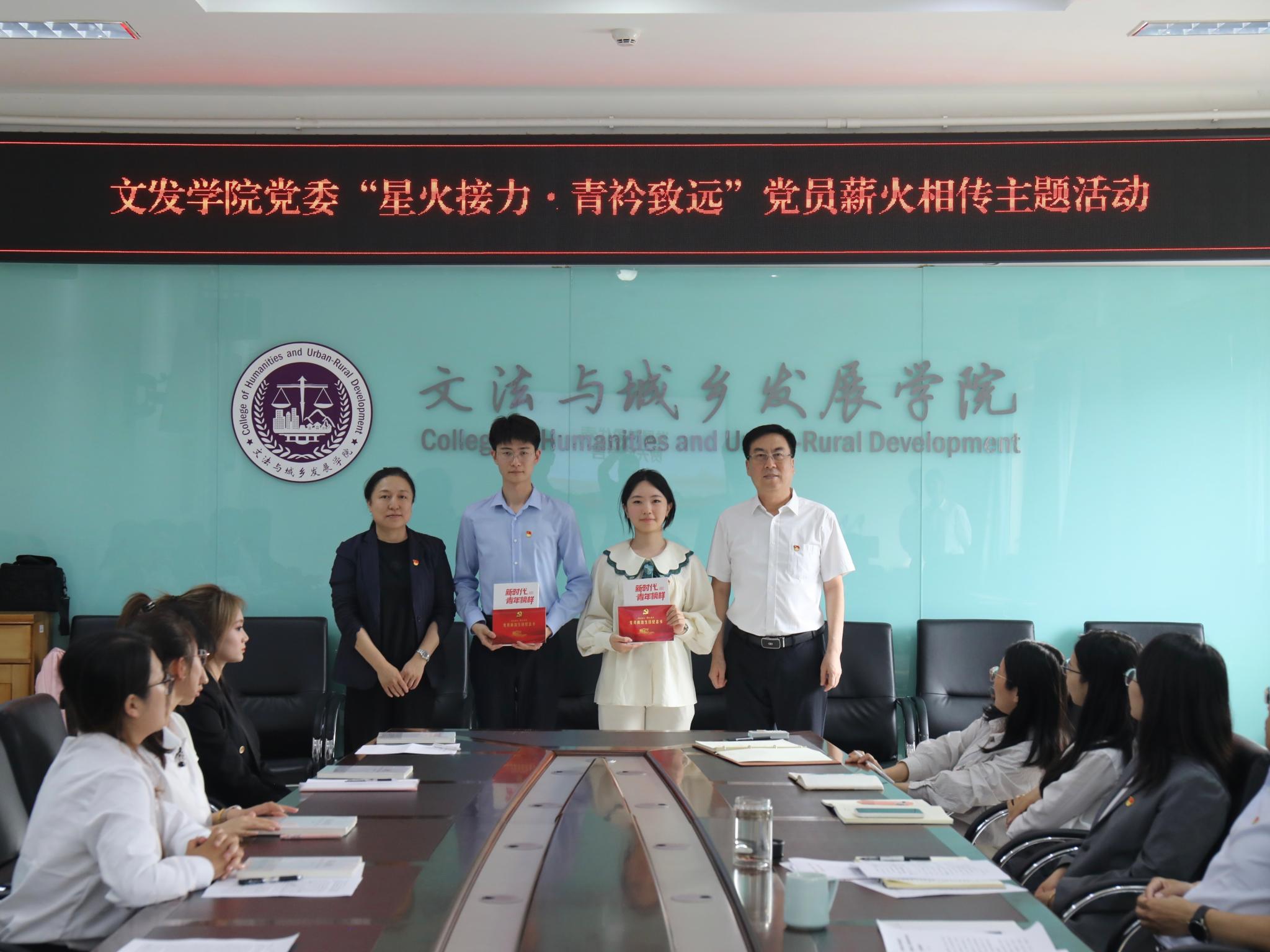 学院教师向毕业生党员代表颁发党员政治生日卡和书籍《新时代青年榜样》,向发展对象代表赠予书籍《我心向党》。全体党员一同重温了入党誓词。